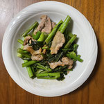 材料 牛肉 100g 小松菜 50g(1/2束)白ネギ 1本 オリーブ油 15ml 砂糖(三温糖)醬油・
