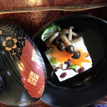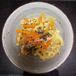 大根を千切り(人参少量)にして、水けを絞り、甘酢(砂糖15g、りんご酢15ml)でいただく。柚子の皮(レモンの皮)を細く切り、トッピングする。野菜の千切りは調理器具を使うと便利です