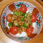 材料 オクラ 1袋 100g ひきわり納豆 1パック 削り鰹節 1袋4gミニトマト5個 醬油15ml