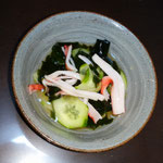 生わかめは、水に浸け塩分を除き、熱湯に浸すと柔らかく、緑色が濃くなる。細切りにして、3杯酢(砂糖15g、酢15ml 醬油5ml)で味付けして頂く。しらすを加えてもおいしい。